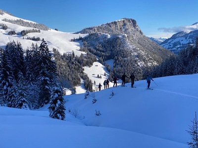 So treffen wir uns erst um 9:30, im Menniggrund (1229M.ü.M). Nach einem kurzen Infoblock über die Verhältnisse (es hat gestürmt und etwas geschneit) machen wir uns in zwei Gruppen auf den Weg Richtung Meniggrat. Der stahlblaue Himmel und die ersten Sonnenstrahlen am Gegenhang lassen vermuten, dass der noch sehr böige Wind im Laufe des Aufstiegs (hoffentlich) zurückgehen wird. Die Leiter nehmen es gemütlich. Bei der Sennhütte angekommen (1594 M.üM.) gibt es einen ersten Rast an der wärmenden Sonne, welche hinter dem Berg namens «Ring» aufgegangen ist. Weiter geht’s hoch über windgepressten Schnee hin zum steileren Anstieg. Hier lacht uns schon viel Pulverschnee an. In zwei Gruppen aufgeteilt und mit sicherem Abstand geht’s steil hoch zum Wald. Die stürmische Nacht hat gezaubert und die Landschaft erneut in eine Winter Wunderwelt verwandelt: Sonne, blauer Himmel, tief verschneite Tannen, glitzernde (noch) unverfahrener Schneefelder! Und der Höhepunkt – oh Wunder – oben (1949 M.ü.M) angekommen bläst kein Wind mehr und wir können unseren Mittagsrast gemütlich an der wärmenden Sonne geniessen. Gestärkt und erholt nehmen wir die Abfahrt in Angriff. Zuerst etwas Windharsch und festgepresster Schnee, dann aber im Steilhang beste Pulververhältnisse. Wer hätte das gedacht? Wie immer entlocken diese Verhältnisse der einen oder dem anderen einen Jubelschrei. Einfach schön! Zum Schluss gehen wir noch etwas trinken, um den schönen Tag gemeinsam ausklingen zu lassen. Erneut bin ich von der guten und durchdachten Planung und Leitung von Sandra und René beeindruckt. Ihr seid einfach grossartig!
