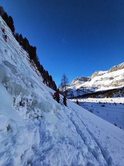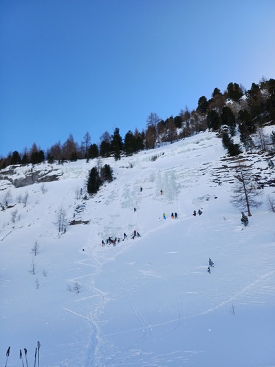 Inzwischen ist allerdings noch etwas anderes zu vernehmen: Die Stimmen und das Gewusel einer gar nicht mal so kleinen Gruppe am Wandfuss nämlich. Ein Jugendlager hat sich für heute tatsächlich dasselbe Ziel ausgesucht, und so wird’s nach und nach enger an der anfängertauglichen Eiswand. Inzwischen muss man schon ganz gut zielen, dass mit dem unvermeidlich absplitternden Eis beim Setzen der Eisgeräte niemand getüpft wird. Anlass genug, dass wir uns nach der Mittagspause (welche einige von uns dank (oder wars trotz?) high-tech-App gekonnt nicht an der Sonne verbrachten) in den rechten Wandteil verschieben. Hier gibt's noch mehr Platz, sodass wir uns an den steileren – und schöneren – Routen wieder gefahrlos austoben können. Genau das tun wir auch, und zwar so lange, dass wir uns plötzlich ganz schön sputen müssen mit Routen abbauen und zusammenpacken. In zügigem Tempo, was an der nachmittäglichen Sonne die eine oder andere Schweisstropfe fordert, eilen wir zurück zur Bahn und erreichen diese noch rechtzeitig, so dass wir unsere Heimreise plangemäss antreten können. Ein äusserst erlebnis- und lehrreicher Tag geht damit langsam zu Ende und wir freuen uns schon jetzt aufs nächste Mal…