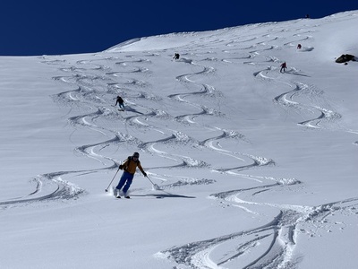 Es waren wundervolle Schneeverhältnisse. Über die weiten Pulverhänge konnten wir mindestens zwei mal 15 schöne Schwünge ziehen (= gemäss einem Bergführer ist dies die Mindestanzahl für eine gelungene Tour!). Es hat heute für viele Touren gereicht…