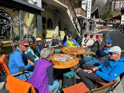 Endlich ist Leukerbad in Sichtweite. Der Schlussteil unserer langen Abfahrt nach Leukerbad gelingt mit ein paar kurzen Graspassagen, den letzten Abschnitt auf Tannzapfen gespickter Piste. Glücklich ob des gelungenen Abschlusses dieser «luftigen» Tour kann das «Abschlussbier» im besonnten Freien genossen werden. (danke Gerhard). Zu guter Letzt ergreift Meister Wind doch nochmals das Szepter: am Bahnhof in Leuk hält er seine «Abschlussrede»! Die metereologischen Umstände dieser Tour vermochten die Teilnehmenden keinesfalls zu verdriessen.
