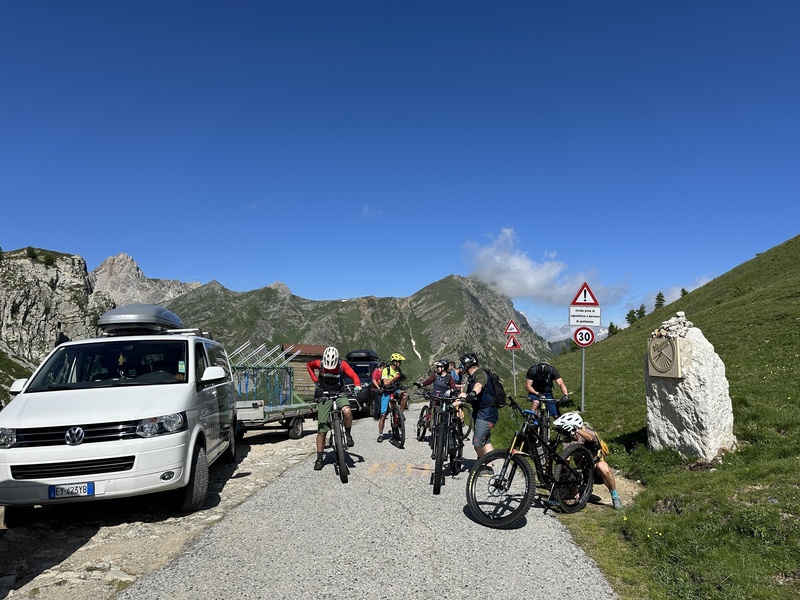 In unserer Unterkunft Pensione Ceaglio wurden wir von der familiären Crew kulinarisch verwöhnt (ob Schweinebacke oder gebackene Zucchiniblüten, jeder kam auf seine Kosten), allabendlich wurde ein 7- Gänger serviert. Diesen haben wir uns jeweils auch verdient, waren unsere Touren doch eher streng und schweisstreibend! Am Morgen starteten wir zwar meistens mit dem hoteleigenen Shuttledienst, der uns jeweils bis zu 800 hm abnahm und um den wir sehr froh waren. Danach aber ging es los, über Militärstrassen (eben keine Militeerstrassen), Singletrails, Schneefelder, Felsstufen und hochalpine Matten ging es dem nächsten Colle oder Monte entgegen. Fast täglich musste das Bike auch mal gestossen oder getragen werden. Darauf folgte meistens eine fulminante Abfahrt, eher knackig, selten flowig, meistens steil und immer landschaftlich atemberaubend. Die Blumenpracht der Wiesen dieser Region sucht seinesgleichen, auch die Botaniker unter uns kannten längst nicht alle Pflänzchen…