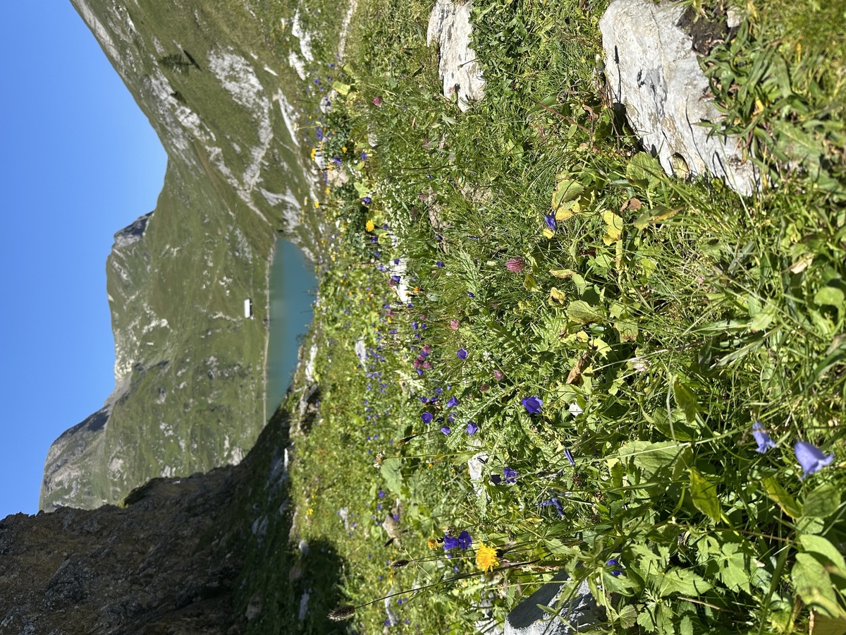 Knapp neun Stunden hat die Rundtour gedauert, bis wir wieder auf der Hüttenterrasse sitzen und dringend benötigte Flüssigkeit nachladen können. Frisch betankt und mit wieder vollen Rucksäcken nehmen wir den Abstieg unter die Füsse. Während das gestern hochwärts fast nebenbei ging, fühlt sich der Weg heute eher zäh an. Um von den schon etwas müden Beinen und der grossen Hitze abzulenken, malen wir uns schon eifrig aus, womit wir – einmal im Restaurant unten angekommen – Kehle und Geist verwöhnen werden.